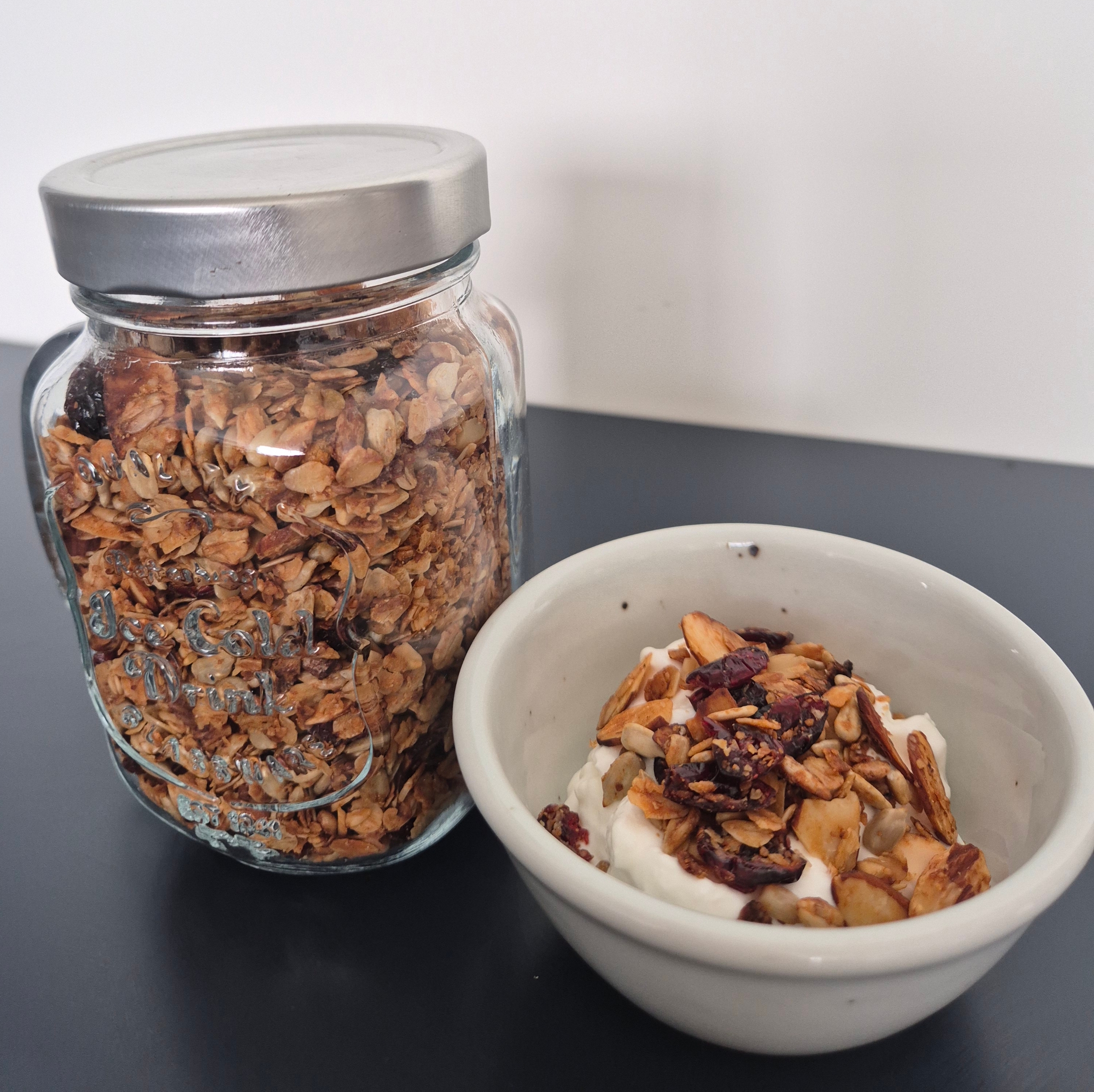 다 구워진 그래놀라는 충분히 식혀주면 더 바삭해져요. 한 입 먹어보니… 와! 진짜 시판 제품 못지않게 맛있더라구요😍 바삭바삭한 식감에 크랜베리의 새콤함, 꿀의 은은한 달콤함까지 완벽한 조합이었어요. 집에서 만든 그릭요거트 위에 뿌려 먹으니 든든한 한 끼 식사로도 손색이 없었답니다!
