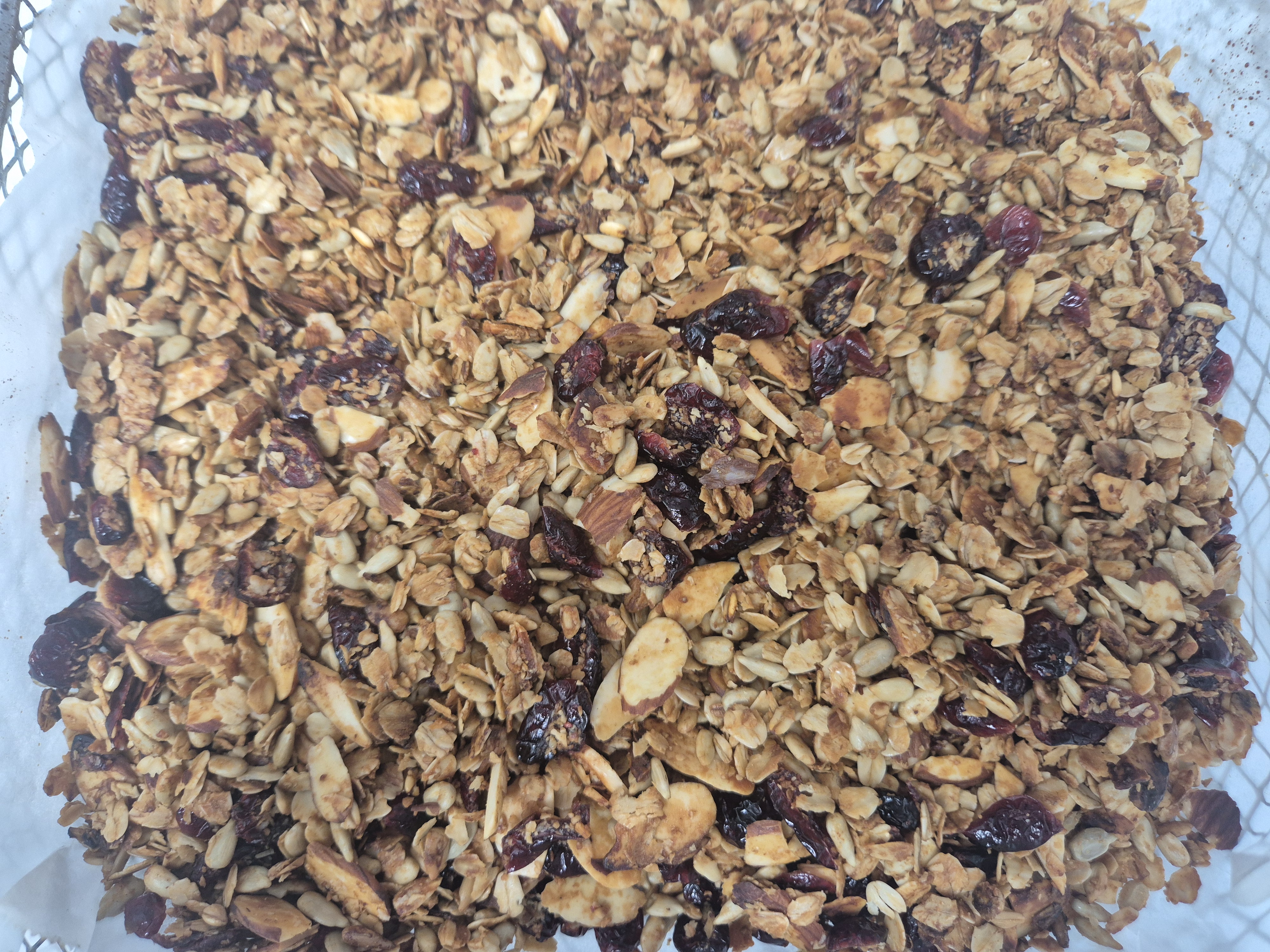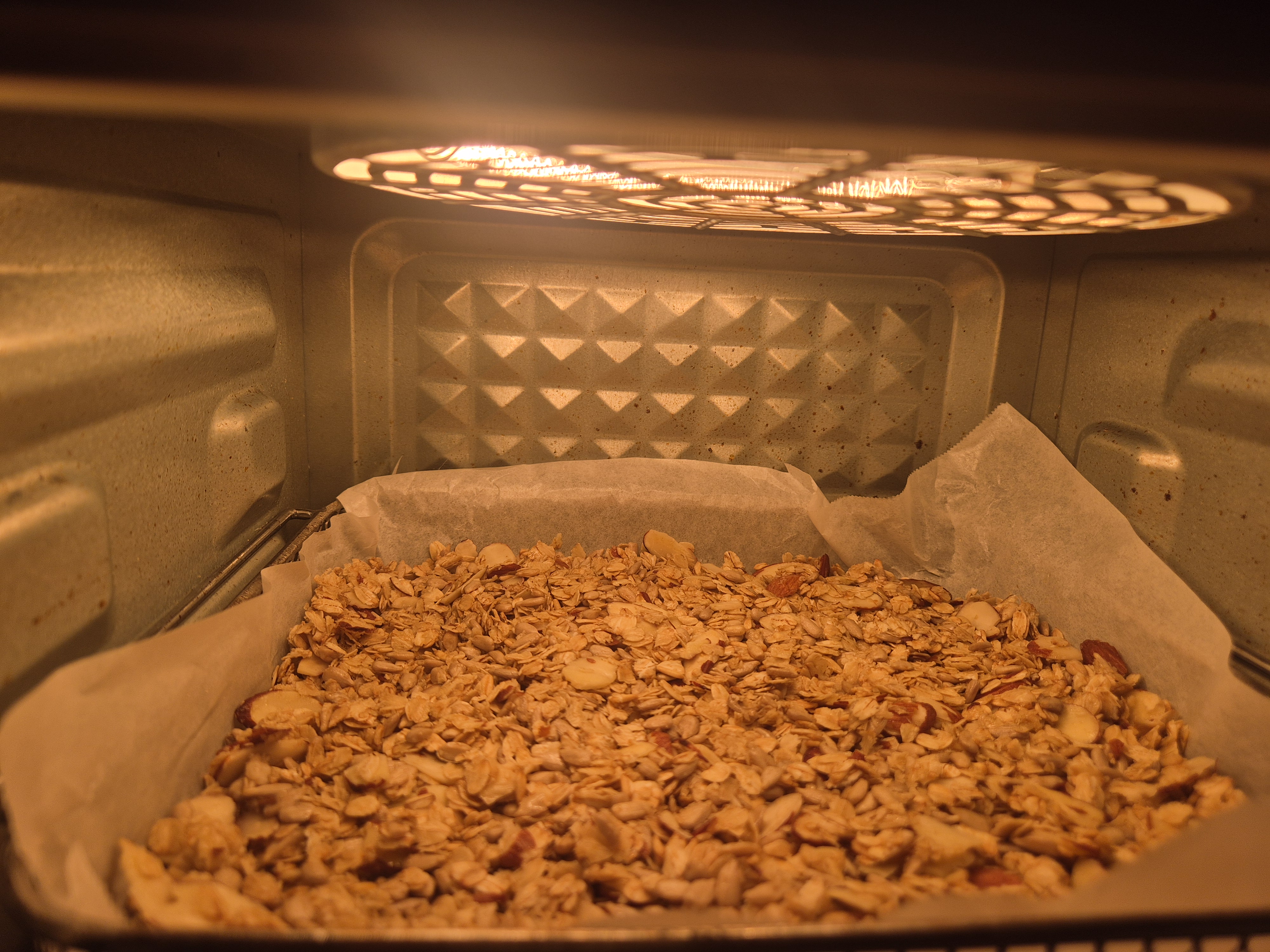 이제 160도로 예열한 에어프라이어나 오븐에 넣고 5분 정도 구워주세요. 그리고 한 번 꺼내서 뒤집듯이 섞어주고 다시 5분! 상태를 보면서 조금씩 시간을 늘려 바삭하게 구워주시면 됩니다. 단, 여기서 중요한 포인트! 너무 오래 구우면 탈 수 있으니 꼭 중간중간 체크해주세요🔥 저는 중간에 냉동고에 있던 크랜베리를 발견해서 뒤늦게 넣었더니 시간이 조금 더 걸렸지만… 결과적으로 더 맛있어졌답니다!